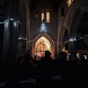 In our service of Choral Evensong (held regularly on the third Sunday of the month) we celebrated our celestial skies with music by Malcolm Archer, Philip Moore, and Stuart Robinson’s “I wonder as I wander” scored for choir, organ, soprano soloist and flute. It closed the service in darkness, except for fairy lights strung the length of the church and the floodlight beyond from our new east window. More about Choral Evensong here.